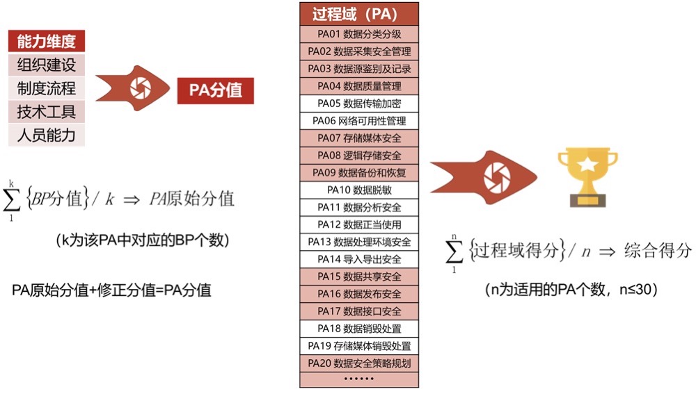 DSMM的評(píng)價(jià)方法主要是評(píng)分制,先對(duì)每個(gè)過程域(PA)的四個(gè)能力維度(BP)進(jìn)行打分,再通過計(jì)算平均分、修正分值的方式得到最終的PA分值,最終得到整體的綜合得分。