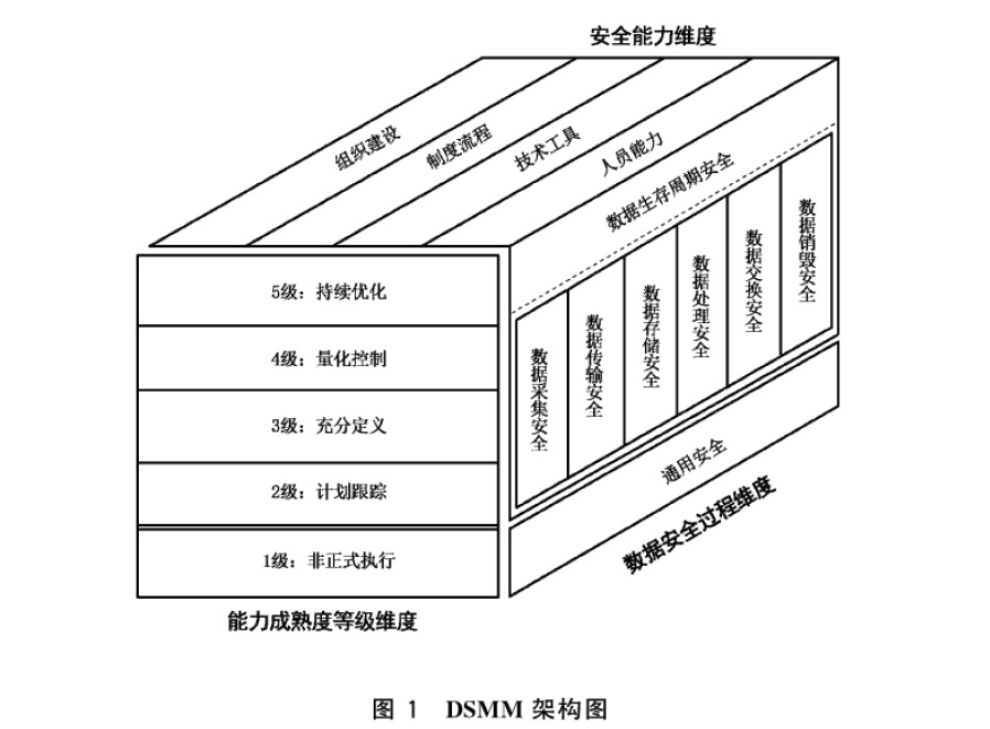 DSMM(Data security capability maturity model)數(shù)據(jù)安全能力成熟度模型,借鑒能力成熟度模型(CMM)的思想,將數(shù)據(jù)按照其生命周期分階段采用不同的能力評(píng)估等級(jí),分為數(shù)據(jù)采集安全、數(shù)據(jù)傳輸安全、數(shù)據(jù)存儲(chǔ)安全、數(shù)據(jù)處理安全、數(shù)據(jù)交換安全、數(shù)據(jù)銷毀安全六個(gè)階段。DSMM從組織建設(shè)、制度流程、技術(shù)工具、人員能力四個(gè)安全能力維度的建設(shè)進(jìn)行綜合考量。DSMM劃分成了1-5個(gè)等級(jí),依次為非正式執(zhí)行級(jí)、計(jì)劃跟蹤級(jí)、充分定義級(jí)、量化控制級(jí)、持續(xù)優(yōu)化級(jí),形成一個(gè)三維立體模型,全方面對(duì)數(shù)據(jù)安全進(jìn)行能力建設(shè)。