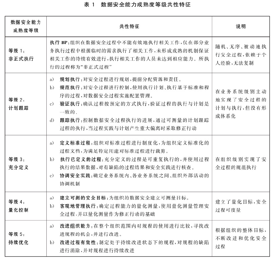 模型分為五個(gè)成熟度等級(jí),一級(jí)是非正式執(zhí)行級(jí),二級(jí)是計(jì)劃跟蹤級(jí),三級(jí)是充分定義級(jí),四級(jí)是量化控制級(jí),五級(jí)是持續(xù)改進(jìn)級(jí)。能力級(jí)別從一級(jí)至五級(jí)逐級(jí)?高,標(biāo)志著組織機(jī)構(gòu)的數(shù)據(jù)安全保障能力的成熟度不斷提升。每個(gè)級(jí)別規(guī)定了對(duì)應(yīng)的公共特征和通用實(shí)踐。